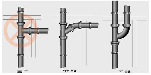 在彎頭和三通處未采用順流配件,增加了水流阻力。或者排水橫管的兩排水口水相向流至兩口間的三通處匯集,從三通的側(cè)端承口接管排走,其弊端不僅是水流不順,而且該管段坡度不合理,極易堵塞。宜將此種“頂頭T”的做法改為彎頭加順?biāo)ǎㄊ欠窀臑閅三通或TY三通)相錯(cuò)開,避免不同方向的排水在平面上正交相遇。